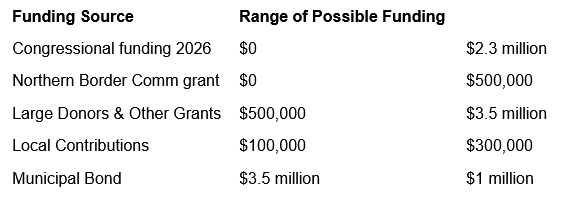 As of April 18, 2025, the Town has applied for $5.2 million in Congressionally Directed Spending in the hope that Congress will resume the program. Increased construction costs since our last application allowed us to increase the amount of our funding request. We have also applied for $500,000 from the Northern Border Regional Commission.