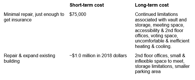 - Our existing town office is structurally unsound, has limited accessibility, lacks safe drinking water, and has insufficient space. We are running on borrowed time until we can move ahead with the new building.